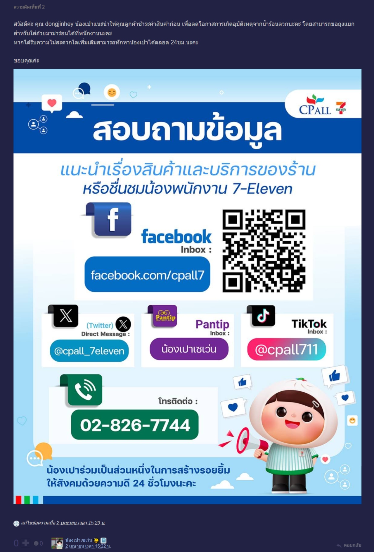เพื่อคลายความสงสัย แอดมิน "น้องเปาเซเว่น" ตัวแทนอย่างเป็นทางการของ 7-Eleven ได้เข้ามาตอบกระทู้ดังกล่าวโดยระบุว่า "แนะนำให้คุณลูกค้าชำระค่าสินค้าก่อน" โดยให้เหตุผลหลักคือเรื่องความปลอดภัย เพื่อลดโอกาสการเกิดอุบัติเหตุจากน้ำร้อนลวกในขณะที่ถือสินค้าเดินไปมาหรือรอคิวชำระเงิน ทั้งนี้ลูกค้าสามารถขอถุงพลาสติกแยกสำหรับใส่ถ้วยร้อนได้จากพนักงานทันทีหลังจากชำระเงินเสร็จสิ้น