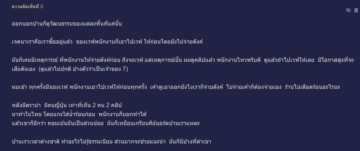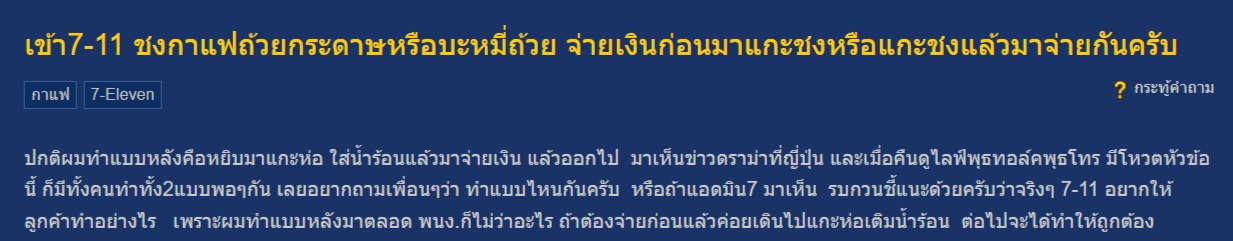 กลายเป็นประเด็นถกเถียงในโลกโซเชียล เมื่อผู้ใช้งานพันทิปรายหนึ่งตั้งคำถามเกี่ยวกับมารยาทและขั้นตอนที่ถูกต้องในการซื้อสินค้าประเภทบะหมี่กึ่งสำเร็จรูปถ้วยหรือกาแฟชงเองในร้าน 7-Eleven ว่าควร "ชำระเงินก่อน" หรือ "แกะชงก่อนแล้วค่อยเดินไปจ่ายเงิน" หลังจากเกิดดราม่าในลักษณะเดียวกันนี้ที่ประเทศญี่ปุ่นและมีการหยิบยกมาพูดคุยในรายการวิทยุชื่อดัง
