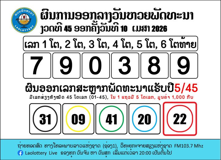 หวยลาววันนี้ 10 เมษายน 2569 ผลหวยลาววันนี้ ตรวจผลหวยลาวพัฒนา