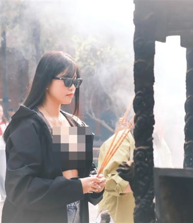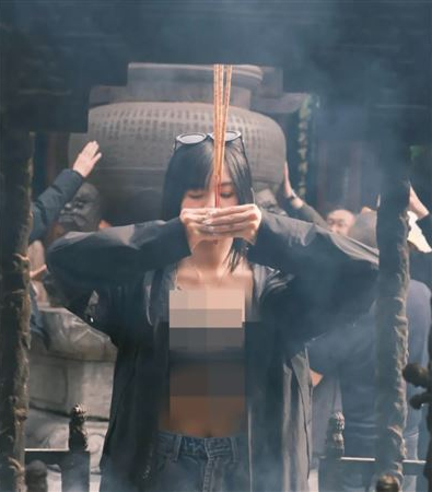 ท่าทาง: แม้ใบหน้าจะดูเคร่งครัดตั้งใจอธิษฐาน แต่การแต่งกายที่ล่อแหลมในสถานที่ศักดิ์สิทธิ์ทำให้ถูกมองว่าเป็นการ "ลบหลู่" มากกว่าศรัทธา