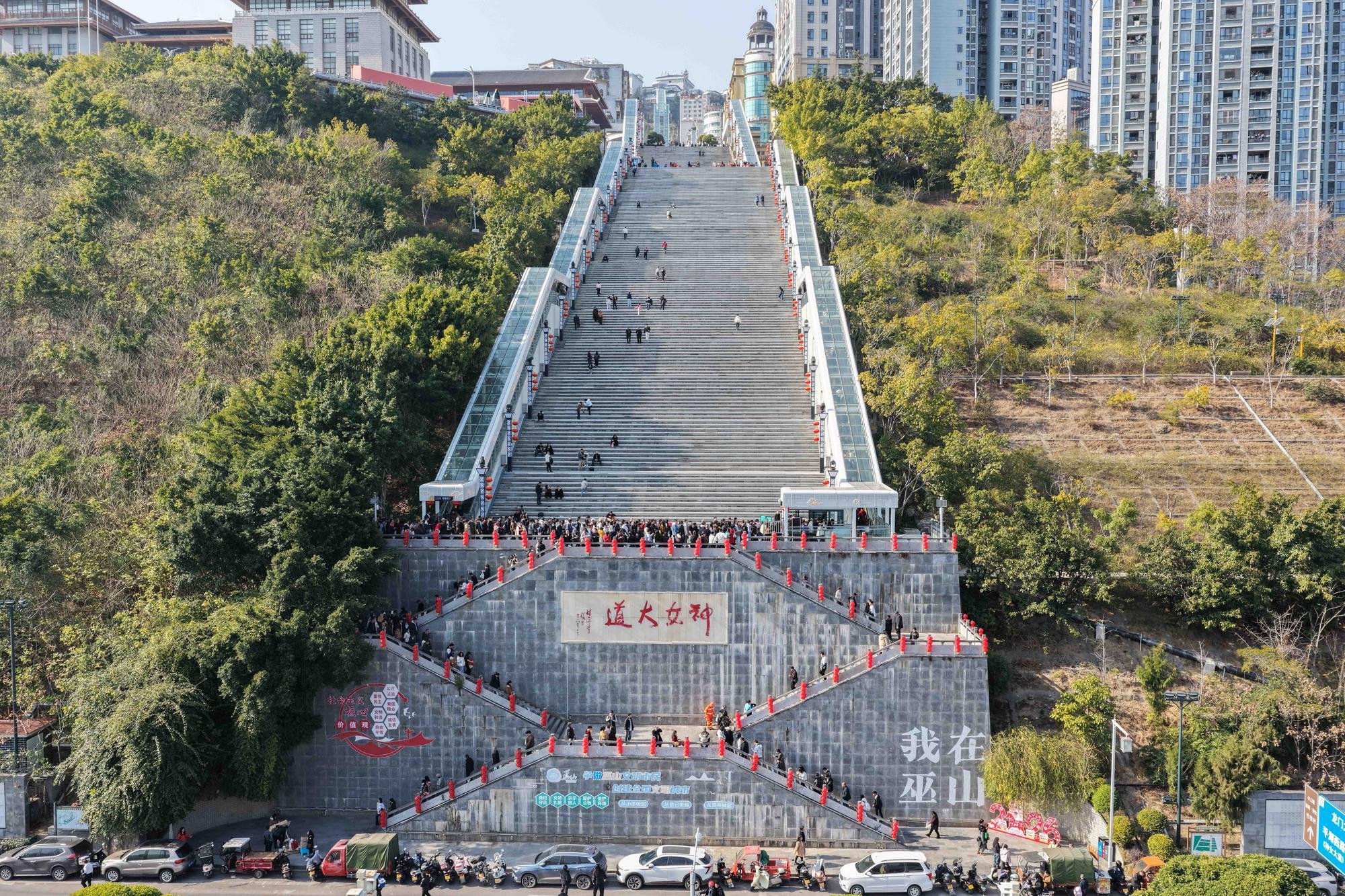 ประเทศจีนเปิดตัวผลงานวิศวกรรมสุดทึ่ง "บันไดเลื่อนกลางแจ้งที่ยาวที่สุดในโลก" ตั้งอยู่ในอำเภออู๋ซาน เทศบาลนครฉงชิ่ง โดยใช้งบประมาณก่อสร้างสูงถึง 23 ล้านดอลลาร์สหรัฐ (ประมาณ 800 ล้านบาท) และได้รับการขนานนามว่า "เทพธิดา" เพื่ออำนวยความสะดวกในการเดินทางข้ามภูมิประเทศที่สูงชันของเมืองแห่งขุนเขา