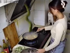 กลายเป็นคลิปไวรัลที่เรียกเสียงฮาและความตกใจไปพร้อมกัน เมื่อหญิงสาวรายหนึ่งกำลังยืนทำอาหารอยู่ในครัวตามปกติ ก่อนเกิดเหตุไม่คาดคิดขึ้นแบบกะทันหัน เมื่อมีงูตัวหนึ่งร่วงลงมากลางกระทะต่อหน้าต่อตา ทำเอาเจ้าตัวรีบตั้งสติและแก้สถานการณ์ทันที