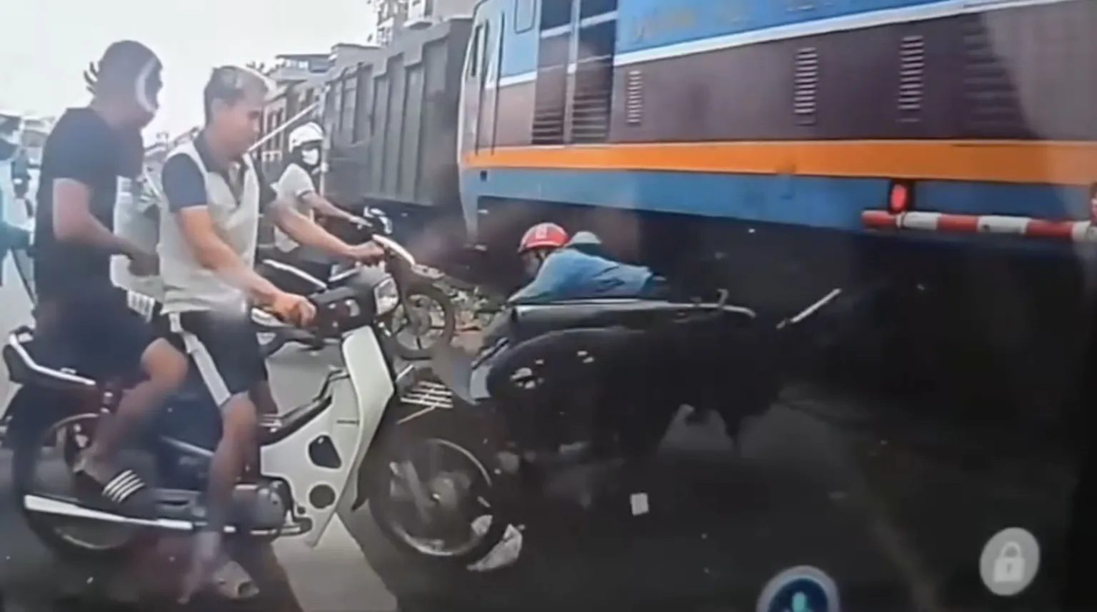 เกิดอุบัติเหตุชวนหวาดเสียวในกรุงฮานอย ประเทศเวียดนาม เมื่อชายขี่รถจักรยานยนต์รายหนึ่งขี่ฝ่าไม้กั้นทางรถไฟ ขณะรถคันอื่นจอดรอสัญญาณอย่างเป็นระเบียบ สุดท้ายถูกรถไฟพุ่งชนท้ายอย่างจัง จนร่างกระเด็นไปกระแทกผู้ใช้ถนนที่รออยู่ฝั่งตรงข้าม สร้างความตกใจให้ผู้เห็นเหตุการณ์อย่างมาก