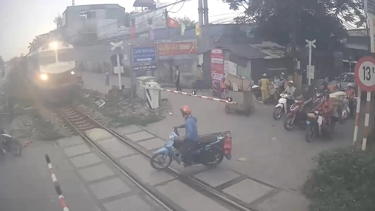 ระทึก! ชายเวียดนามคุยมือถือเพลิน ขี่มอเตอร์ไซค์ฝ่าไม้กั้นรถไฟ โดนชนกระเด็น วุ่นทั้งจุดตัด