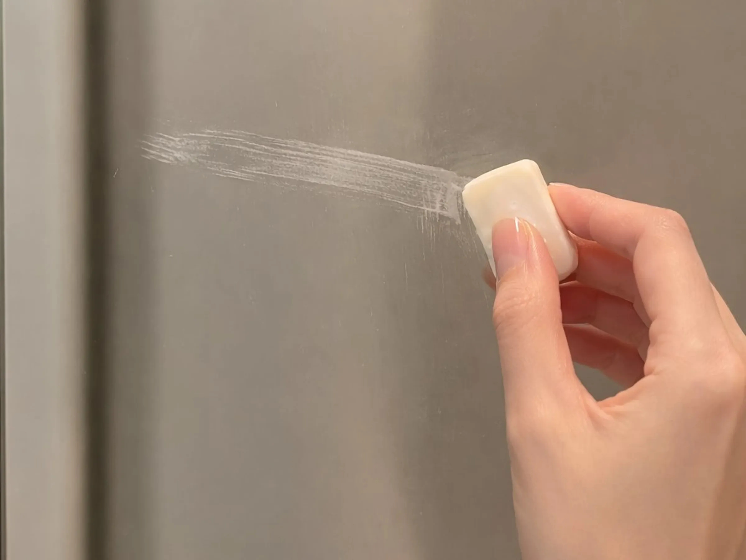 - ใช้สบู่ก้อนแห้ง: นำสบู่ก้อน (จะเป็นสบู่ถูตัวหรือสบู่ซักผ้าก็ได้) มาขีดเป็นรอยลงบนกระจกที่แห้งสนิท โดยออกแรงกดเล็กน้อยให้เห็นคราบสบู่ชัดเจน