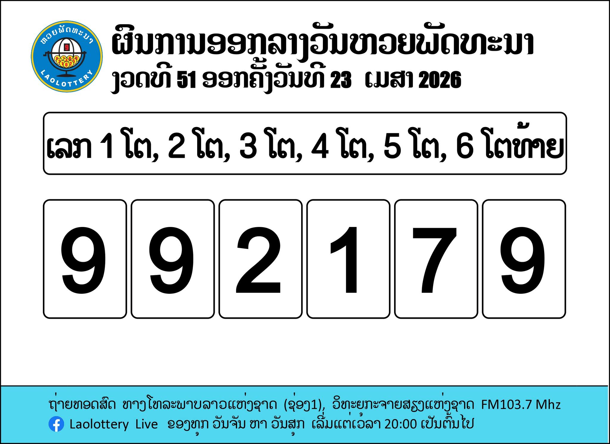 • เลข 6 ตัว : 992179