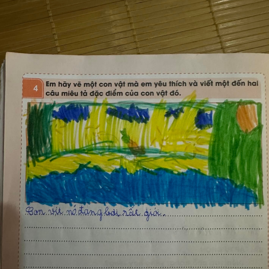ทักษะภาษาดีเยี่ยม: แม้น้องจะเขียนตัวบรรจงไม่เต็มบรรทัดตามระเบียบเป๊ะๆ แต่สิ่งที่น้องเขียนสื่อสารออกมากลับมีพลัง เช่น "ไฟจราจรสวยมาก" หรือ "เป็ดว่ายน้ำเก่งมาก" ซึ่งแสดงถึงการใช้ภาษาที่มีอารมณ์ความรู้สึกและสื่อสารได้ตรงประเด็น