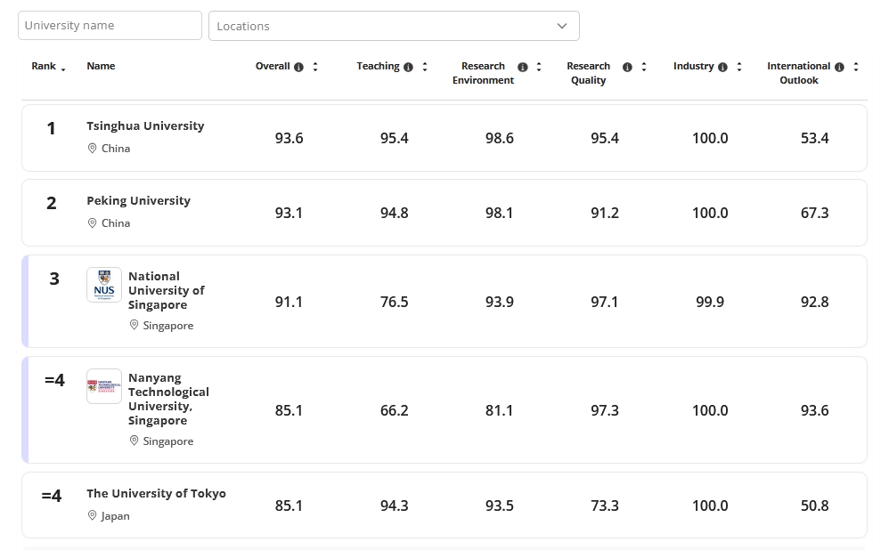 สำหรับในปีนี้ มีการจัดอันดับมหาวิทยาลัยทั้งหมด 929 แห่ง จาก 36 ประเทศ/เขตปกครองทั่วเอเชีย ซึ่งถือว่ามีจำนวนมหาวิทยาลัยที่เข้าร่วมและได้รับการจัดอันดับเพิ่มขึ้นจากปีที่ผ่านๆ มา สะท้อนให้เห็นถึงการแข่งขันและคุณภาพการศึกษาในภูมิภาคเอเชียที่เติบโตขึ้นอย่างต่อเนื่อง