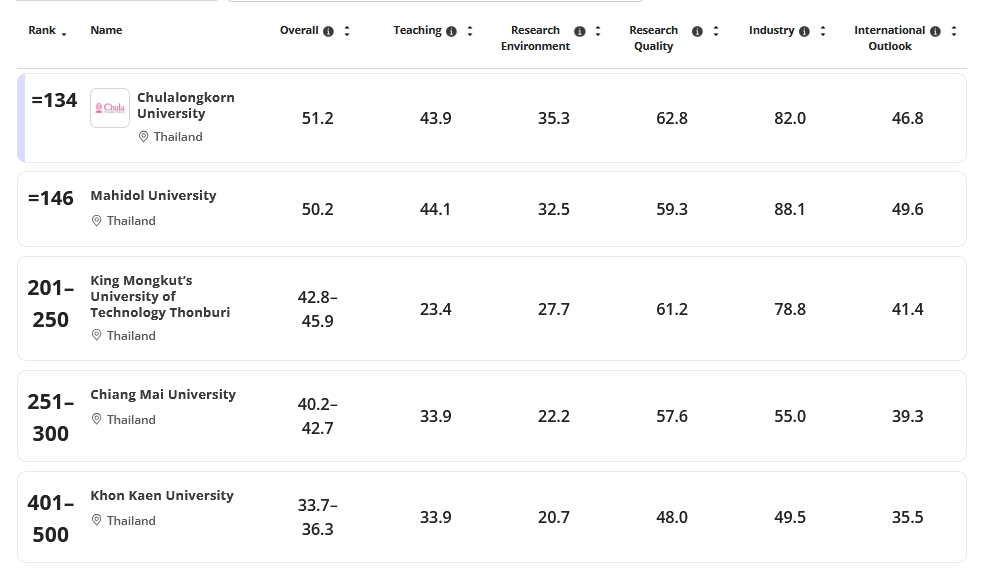 ตรวจสอบอันดับมหาวิทยาลัยอื่นๆ และข้อมูลฉบับเต็มได้ที่เว็บไซต์อย่างเป็นทางการของ Times Higher Education
