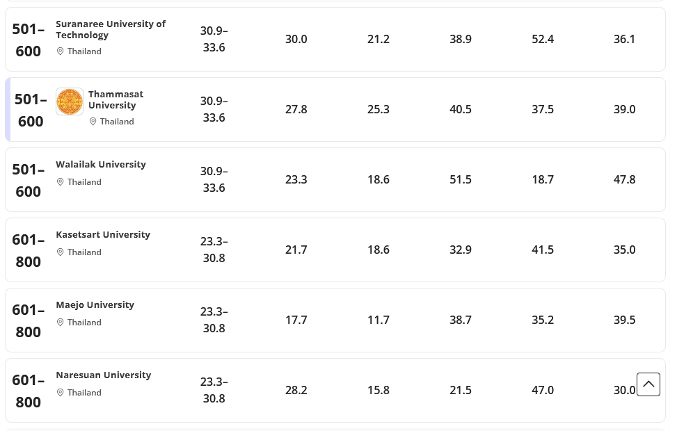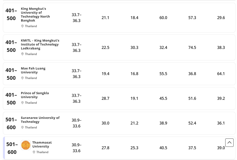 | 10 | มหาวิทยาลัยธรรมศาสตร์ | 501–600 |
