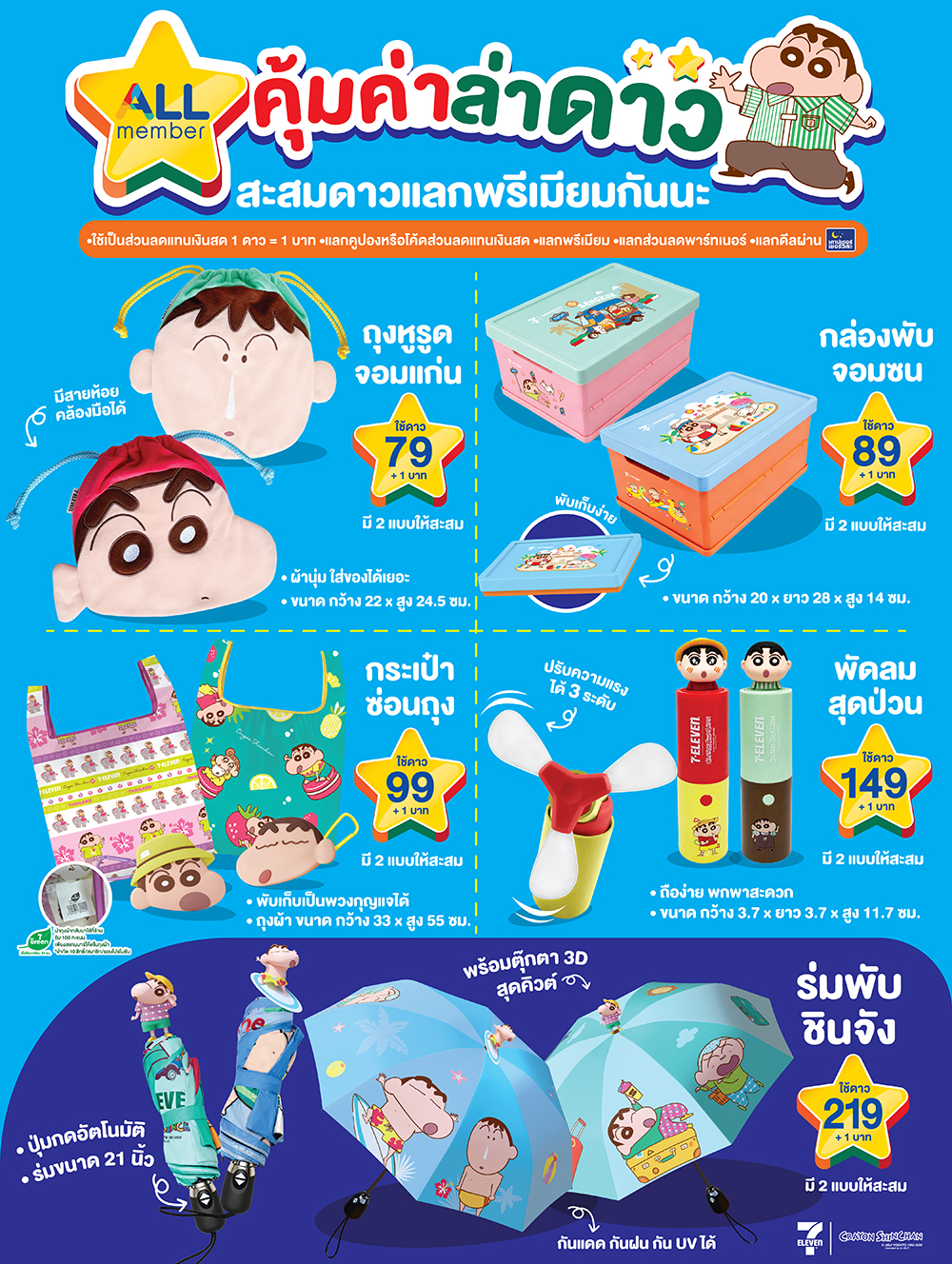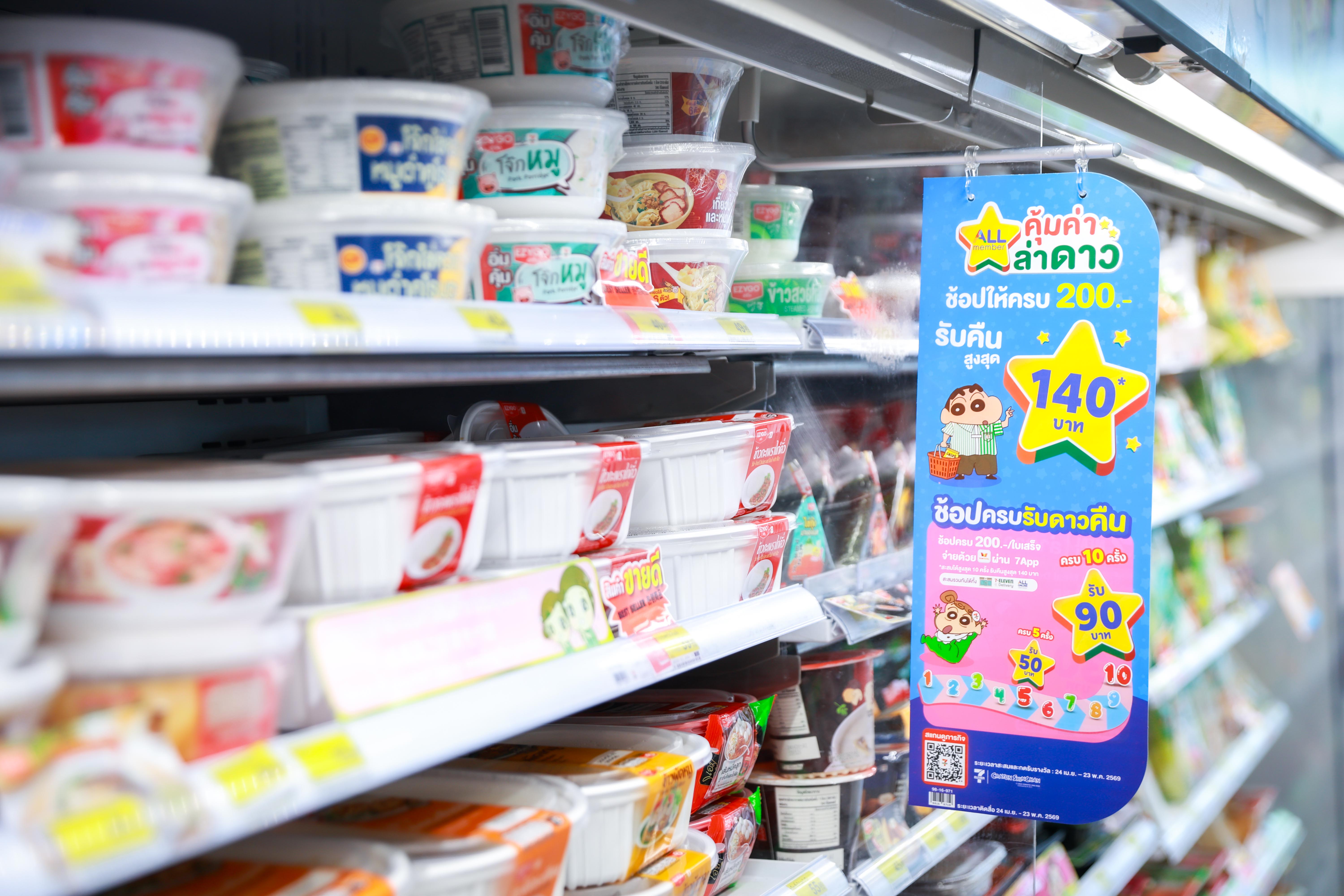 ไฮไลต์สำคัญอยู่ที่การยกระดับ “ความคุ้ม” เซเว่นฯ ขอเสิร์ฟประสบการณ์ใหม่ให้กับสมาชิก ALL member กับแคมเปญ “คุ้มค่า ล่าดาว” ภายใต้คอนเซปต์ “มีดาว = มีเงิน” ที่เปลี่ยนการซื้อของธรรมดาให้กลายเป็นความคุ้มแบบต่อเนื่อง โดยลูกค้าสามารถสะสม “ดาว” จากการซื้อสินค้าที่ร่วมรายการ เพื่อนำไปใช้เป็นส่วนลดแทนเงินสด เพิ่มความคุ้มค่าด้วยการแลกคูปอง แลกของพรีเมียมชินจังคอลเลกชันสุดคิวต์ แลกฟรีสินค้าช่วยค่าครองชีพ รวมถึงดีลพิเศษจากพาร์ทเนอร์และสิทธิประโยชน์ผ่านเคาน์เตอร์เซอร์วิส เรียกได้ว่าเป็นแพ็คความคุ้มที่ตอบโจทย์ทั้งสายประหยัดและสายช้อป