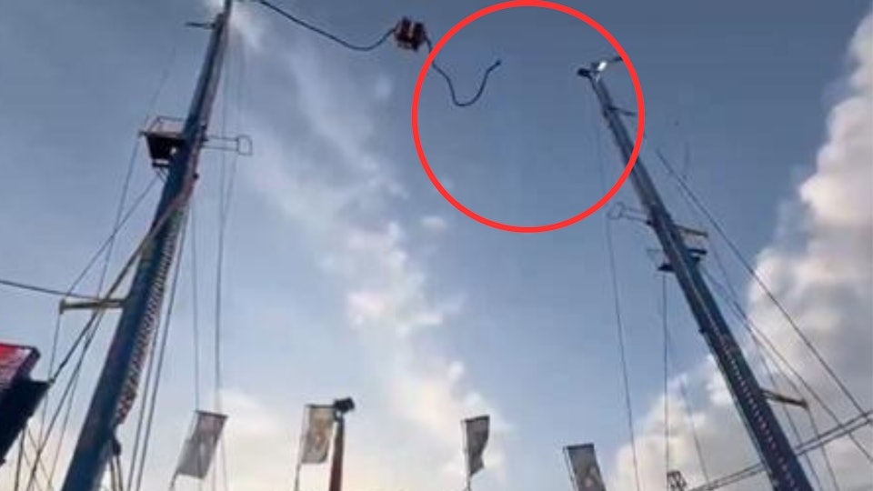 นาทีระทึก! สลิงเครื่องเล่นขาดขณะพุ่งสูงสุด เหวี่ยงกระแทกเสา ทำ 2 ผู้เล่นค้างกลางเวหาสูง 90 เมตร