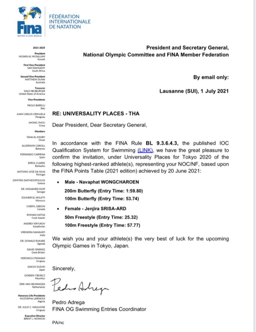 สหพันธ์ว่ายน้ำนานาชาติ หรือฟีน่า ประกาศรายชื่อนักกีฬาว่ายน้ำทุกประเภทอย่างเป็นทางการ ที่จะลงเเข่งขันในมหกรรมกีฬาโอลิมปิก2020 ที่ญี่ปุ่น ซึ่งเลื่อนมาจัดในปีนี้ช่วงปลายเดือนก.ค. ด้วยสถานการณ์ระบาดของไวรัสโควิด-19