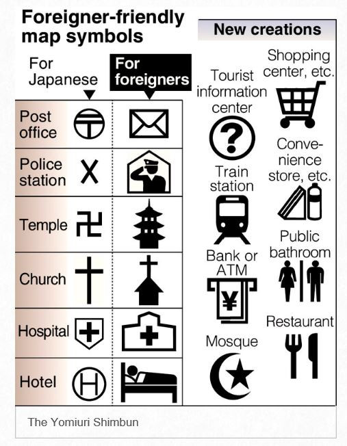 หรือสัญลักษณ์ที่บอกข้อมูลอย่าง ธนาคารที่เป็นรูปมือถือธนบัตร หรือ วงกลมล้อมรอบช้อนส้อมที่สื่อไปถึงร้านอาหาร เช่นเดียวกับรูปมือที่นิ้วมีผ้าพันแผลและเครื่องหมายบวกที่ทำให้รู้ได้ทันทีว่าคือสถานที่ปฐมพยาบาล