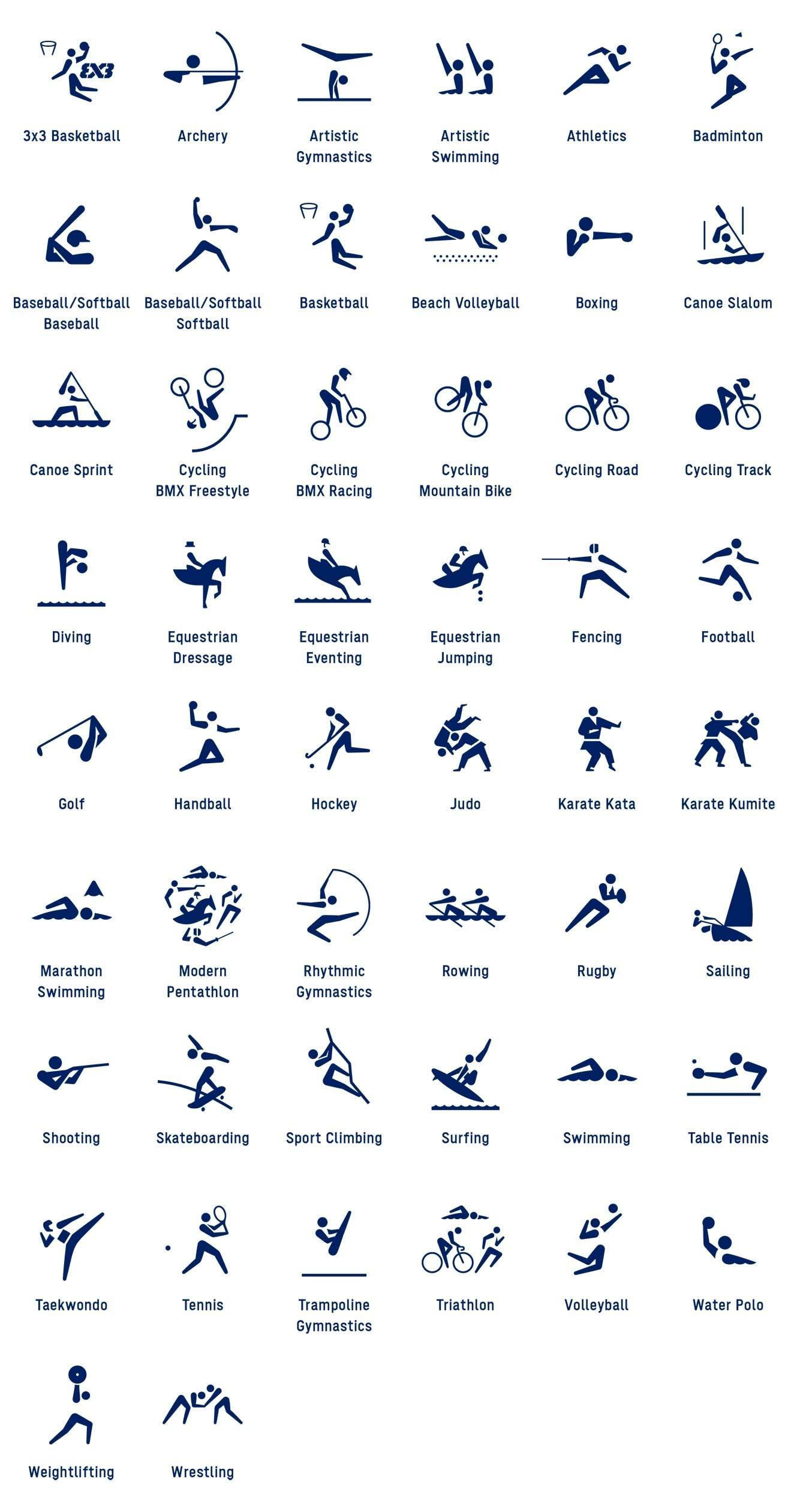 สำหรับพิคโตแกรม 2020 ถูกทำออกมาถึง 50 ภาพ จาก 33 ชนิดกีฬาในโอลิมปิก ซึ่งทำให้กีฬาบางประเภทอย่างจักรยานหรือขี่ม้ามีมากกว่า 1 ภาพ ในขณะที่พาราลิมปิกมีทั้งหมด 23 ภาพจาก 22 ชนิดกีฬา และทั้งสองรายการนี้ ยังถูกแบ่งออกเป็นสองเซ็ต คือแบบไม่มีกรอบและแบบมีกรอบ