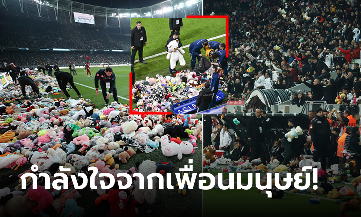 แด่เด็กๆผู้ประสบภัย! โมเมนต์ประทับใจแฟนบอลโยนตุ๊กตากว่าหมื่นตัวลงสนามที่ตุรกี (ภาพ)