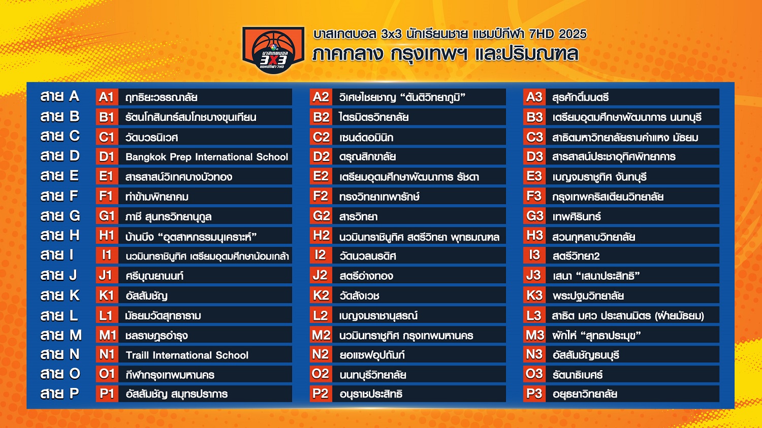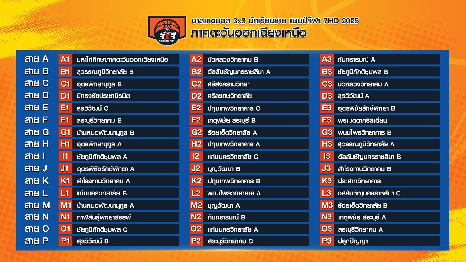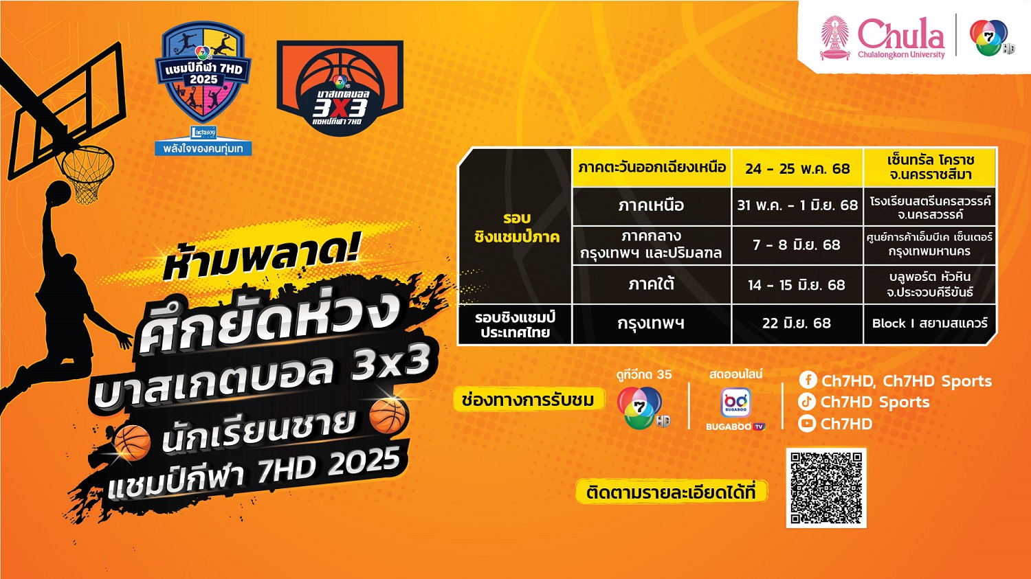 "บาสเกตบอล 3X3 นักเรียนชาย แชมป์กีฬา 7HD 2025" แบ่งสายชิงแชมป์ภูมิภาค เปิดสนามแรกภาคอีสาน 24 พ.ค.นี้จับตาศึกยัดห่วงนักเรียน "ช่อง 7HD" ประกาศผลการจับสลากแบ่งสายรอบชิงแชมป์ภาค การแข่งขัน "บาสเกตบอล 3X3 นักเรียนชาย แชมป์กีฬา 7HD 2025"