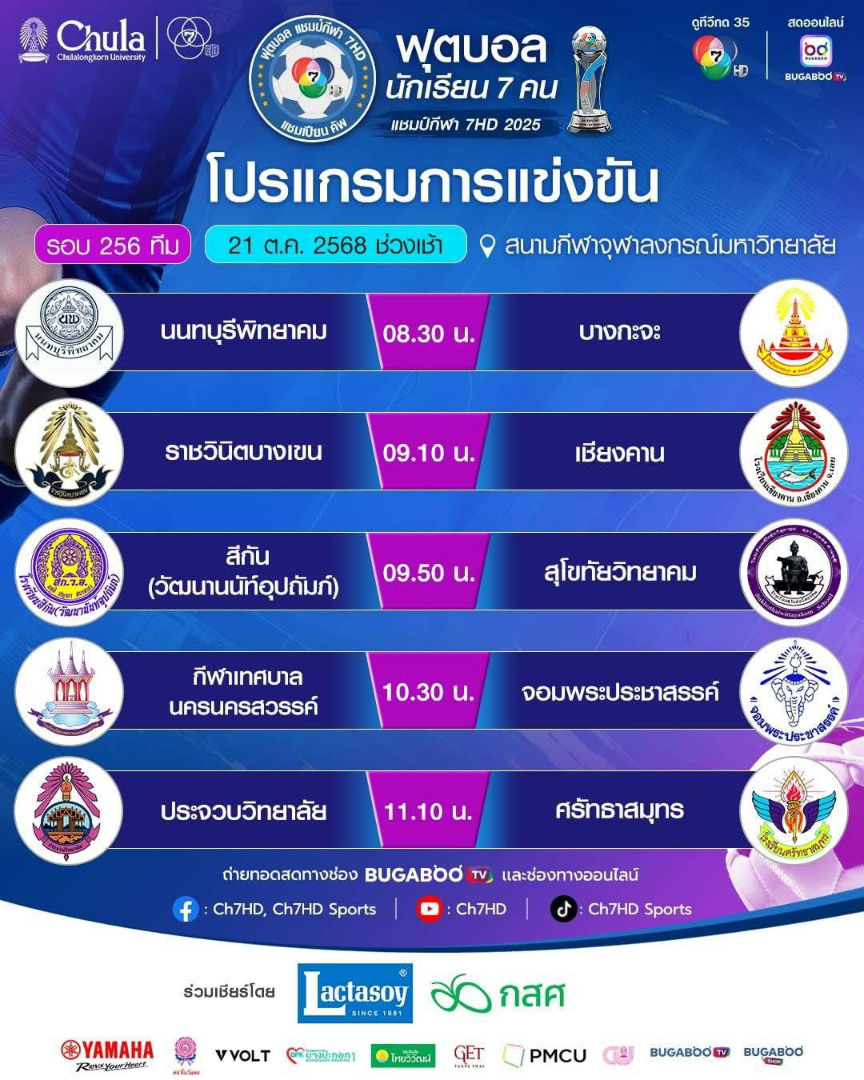 ศึก “ฟุตบอลนักเรียน 7 คน แชมป์กีฬา 7HD แชมเปียน คัพ 2025” มันไม่แผ่ว ทีมดังพาเหรดทะลุรอบ 128 ทีมทีมวาง B ออกสตาร์ทศึก “ฟุตบอลนักเรียน 7 คน แชมป์กีฬา 7HD แชมเปียน คัพ 2025” รอบ 256 ทีม