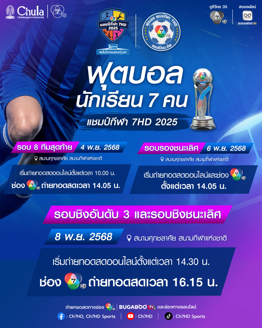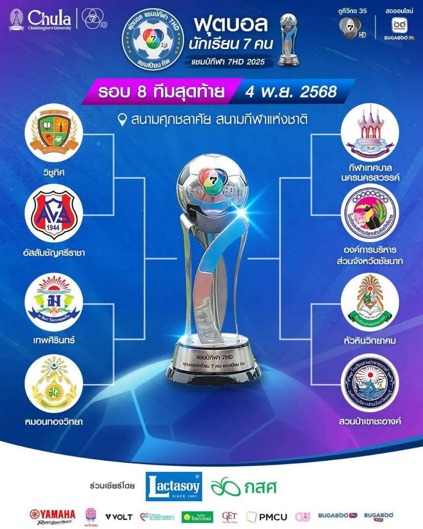 คอนเฟิร์ม 8 ทีมสุดท้าย ศึก “ฟุตบอลนักเรียน 7 คน แชมป์กีฬา 7HD แชมเปียน คัพ 2025”มันเอาเรื่อง ศึกลูกหนังขาสั้น “ฟุตบอลนักเรียน 7 คน แชมป์กีฬา 7HD แชมเปียน คัพ 2025” รอบ 16 ทีมสุดท้าย ใส่สุดมันทุกคู่ ก่อนส่งตั๋วให้ 8 ทีมแข้งเทพ