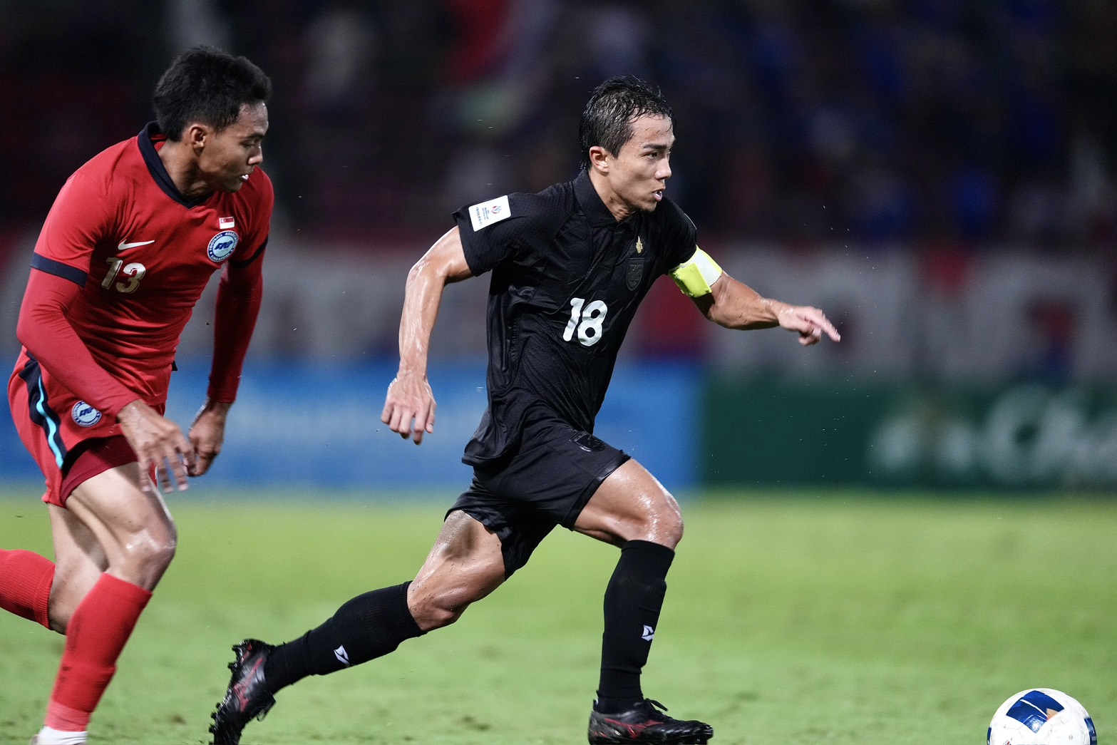 เริ่มเกมมาเพียง 3 นาที ไทย มีโอกาสลุ้นยิงประตูขึ้นนำ ธีราทร บุญมาทัน จ่ายบอลเข้ากรอบเขตโทษมาให้ สุภโชค สารชาติ ได้ยิงด้วยขวาไปติดเซฟผู้รักษาประตูสิงคโปร์