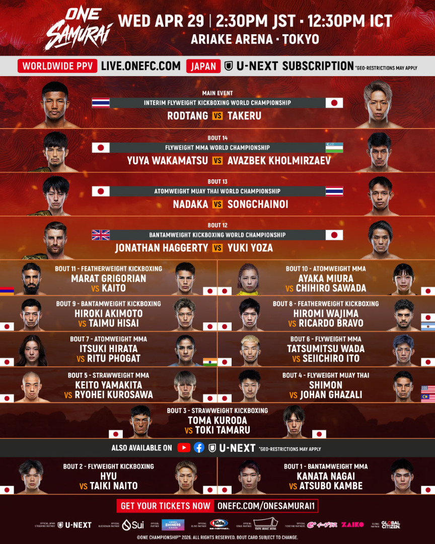 ชักธงรบ! 30 นักสู้ผ่านด่านตาชั่ง พร้อมบู๊แหลกศึก ONE ซามูไร 1 พุธ 29 เม.ย.นี้แฟนกีฬาต่อสู้ใน 195 ประเทศทั่วโลก เตรียมตัวรับความมันครั้งประวัติศาสตร์ในศึกใหญ่ ONE ซามูไร 1 ที่จะจัดการแข่งขันขึ้นในวันพุธที่ 29 เม.ย.นี้