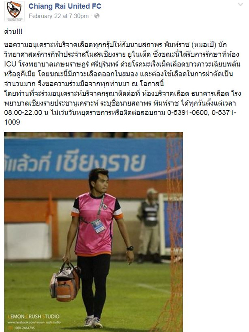 ข่าวเศร้าวงการลูกหนังไทย เมื่อนายสถาพร พิมพ์ราช หรือ หมอเป้ นักวิทยาศาสตร์การกีฬาประจำ เชียงราย ยูไนเต็ด ได้ลาโลกใบนี้ไปอย่างไม่มีวันกลับ หลังจากที่ หมอเป้ ป่วยเป็นโรคมะเร็งเม็ดเลือดขาวภาวะเฉียบพลันหรือลูคีเมีย
