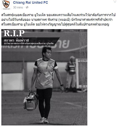 สโมสรฟุตบอลเชียงราย ยูไนเต็ด ขอแสดงความเสียใจและร่วมไว้อาลัยกับการจากไปอย่างไม่มีวันกลับของ นายสถาพร พิมราช (หมอเป้) นักวิทยาศาสตร์การกีฬาประจำสโมสรเชียงราย ยูไนเต็ด ขอให้ดวงวิญญาณไปสู่สุขคติในสัมปรายภพด้วยเทอญ
