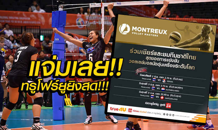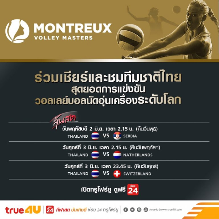 ทรูโฟร์ยู ช่อง 24 ชวนเชียร์ทัพนักตบลูกยางสาวทีมชาติไทย ในการแข่งขันวอลเลย์บอลหญิง มองเทรอซ์ วอลเลย์ มาสเตอร์ 2016 (FIVB Montreux Volleyball Masters) สดจากประเทศสวิสเซอร์แลนด์