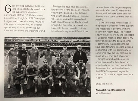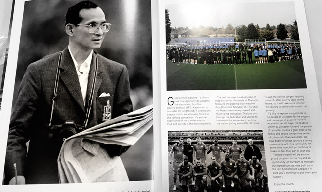 จิ้งจอกรักในหลวง! "เลสเตอร์" แปรอักษร-ฉายพระบรมฉายาลักษณ์ก่อนเกมชปล."เลสเตอร์ ซิตี้" สโมสรชั้นนำแห่งศึกพรีเมียร์ลีก อังกฤษ แสดงความอาลัยด้วยสำนึกในพระมหากรุณาธิคุณพระบาทสมเด็จพระปรมินทรมหาภูมิพลอดุลยเดช