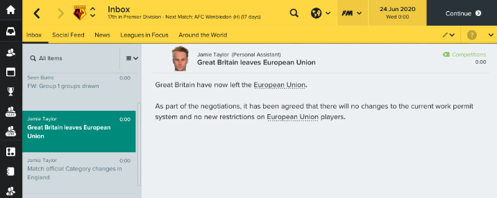 1.แบบซอฟท์ๆ - นั่นก็คือ แม้อังกฤษจะออกจาก EU ไปจริง ทว่าในวงการฟุตบอลนั้นจะได้รับการยกเว้นให้ย้ายตัวได้ตามปกติซึ่งไม่ต้องขอใบอนุญาตอะไร