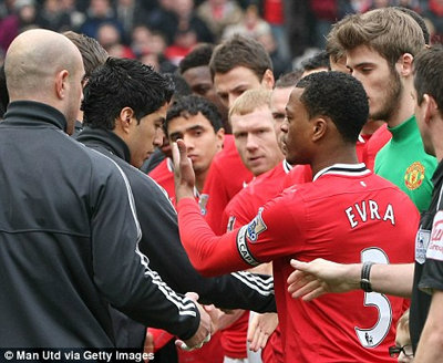 และวินาทีที่ทั้งโลกจับตามองก็มาถึงเมื่อเอฟร่าที่สวมปลอกแขนเป็นกัปตันทีมแมนฯ ยูไนเต็ด ได้รับการจับมือทักทายจากนักเตะลิเวอร์พูลทกุคน จนกระทั่งมาถึงซัวเรซที่อยู่รองสุดท้ายในแถวของหงส์แดง และหัวหอกชาวอุรุกวัยก็เลือกที่จะไม่ทำให้ประเด็นบาดหมางที่เกิดขึ้นจบลงด้วยดี ด้วยการทำเหมือนเอฟร่าไม่มีตัวตนอยู่ตรงนั้นและข้ามไปจับมือกับดาวิด เด เกอาที่ยืนอยู่ถัดไปแทน