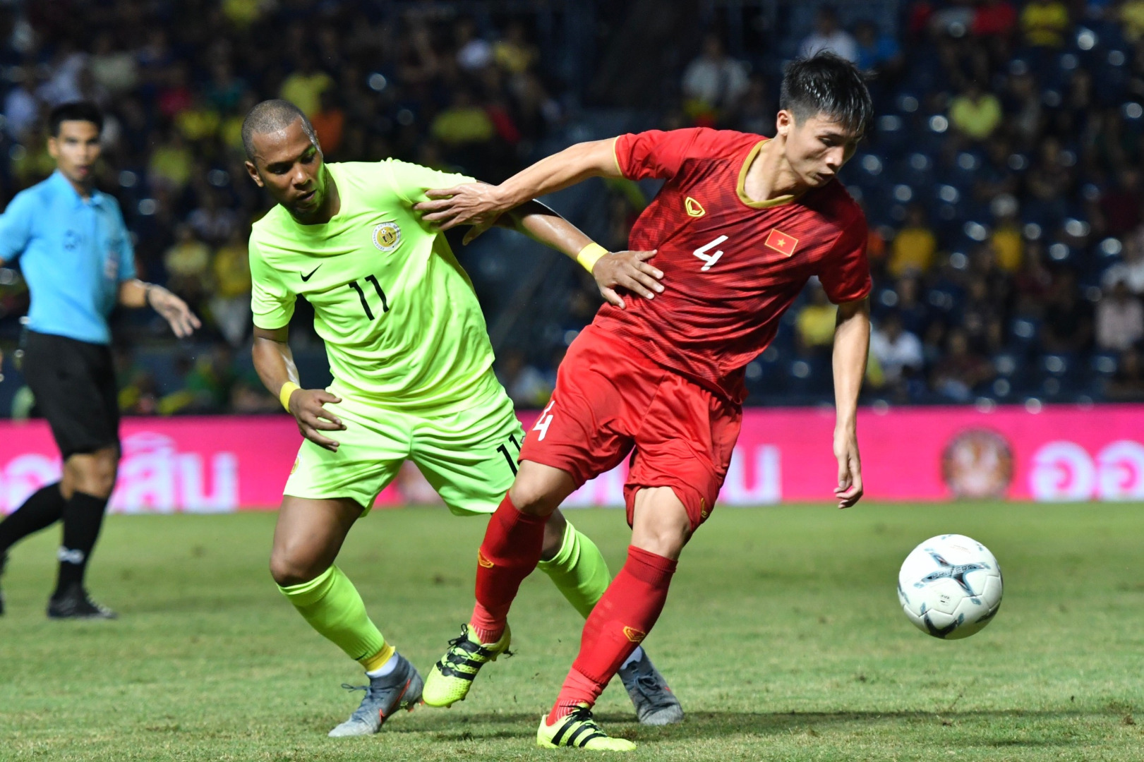 เกมครึ่งแรกสู้กันสูสี นาทีที่ 27 เหงียน คอง เฟือง ไหลบอลให้ เหงียน วาน ต๊วน สอดมาแปบอลออกข้าง
