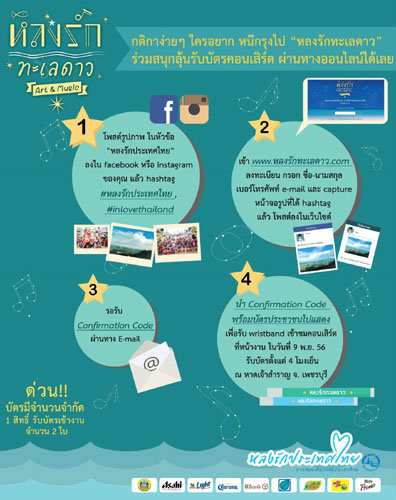 พิเศษ...รับบัตรคอนเสิร์ตฟรีเพียงแค่นำภาพถ่ายแหล่งท่องเที่ยวในประเทศไทยที่มุมที่คุณหลงรักแล้วอัพในเฟสบุ๊คหรืออินสตาแกรมแล้ว Hashtag #หลงรักประเทศไทย หรือ #inlovethailand แล้ว Capture หน้าจอมาลงทะเบียนในเว็บไซต์ www.หลงรักทะเลดาว.com แล้วรออีเมล์ตอบรับ ดูรายละเอียดเพิ่มเติมที่www.หลงรักทะเลดาว.com หรือรับบัตรฟรีในนิตยสารหนีกรุง ฉบับเดือนตุลาคมนี้