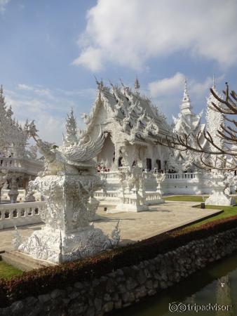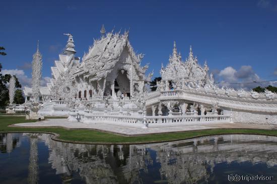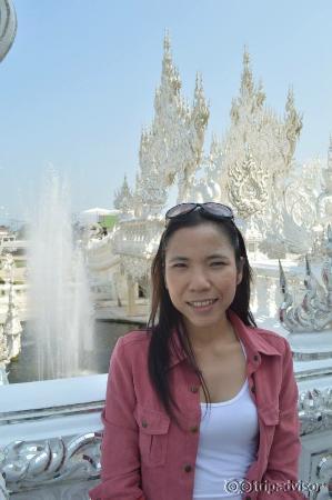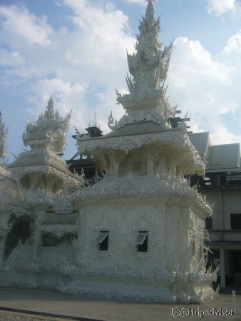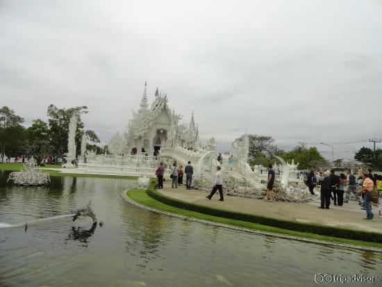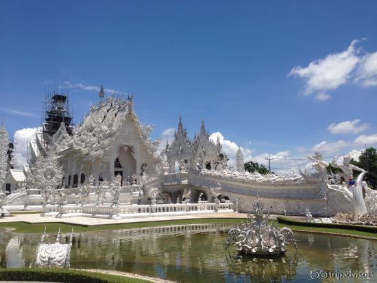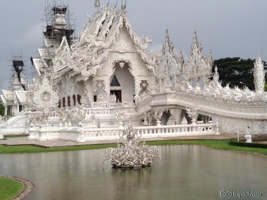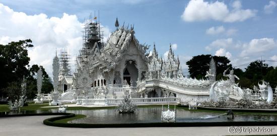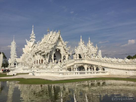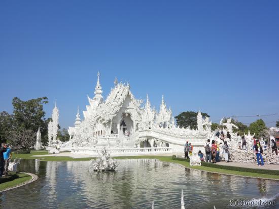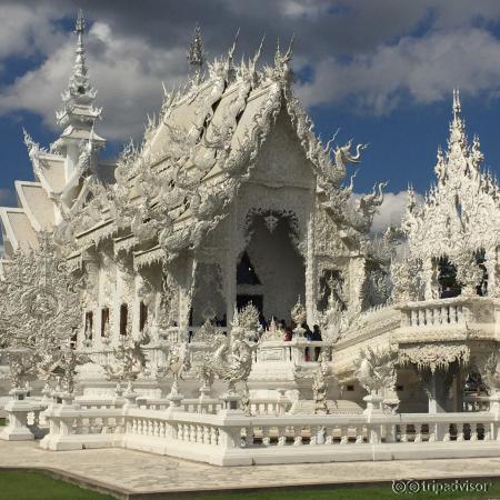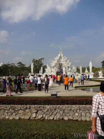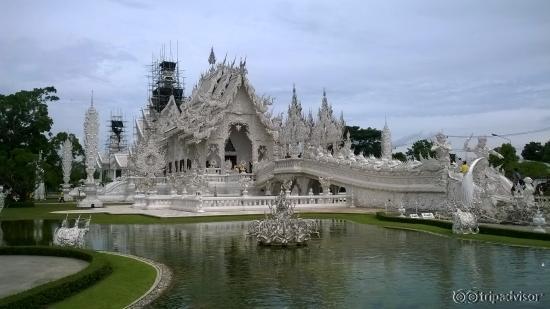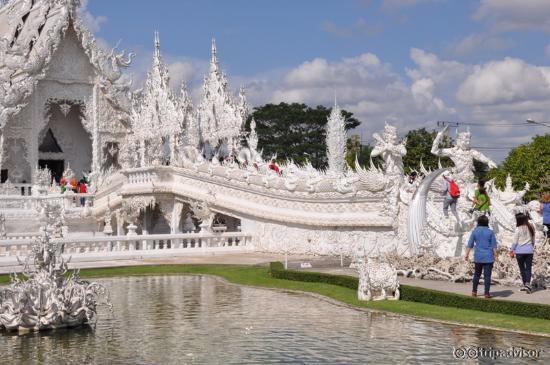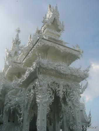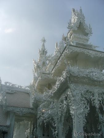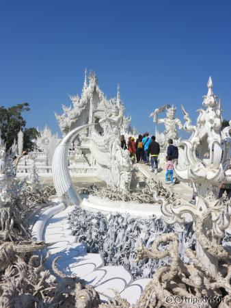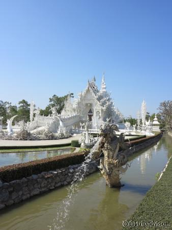 2015.1 初めてチェンマイから3時間かけチェンライのワット・ロン・クンに行きました。数年前の地震で塔の先端が曲がっていましたが、綺麗な白亜の寺院でした。