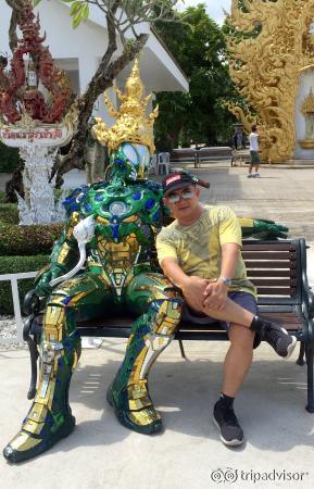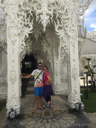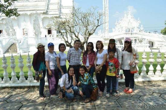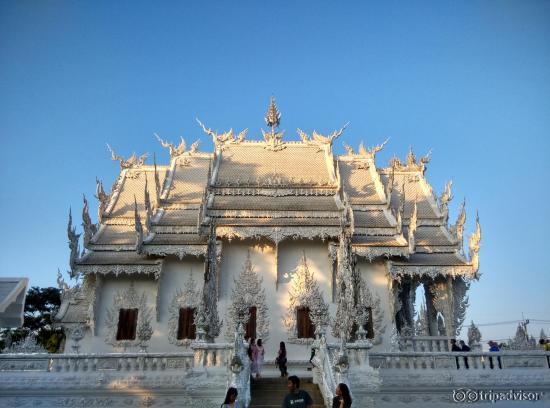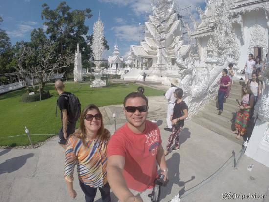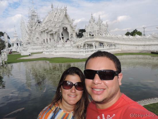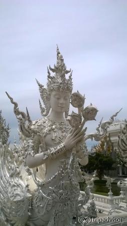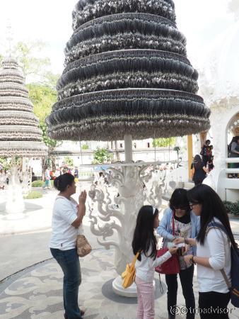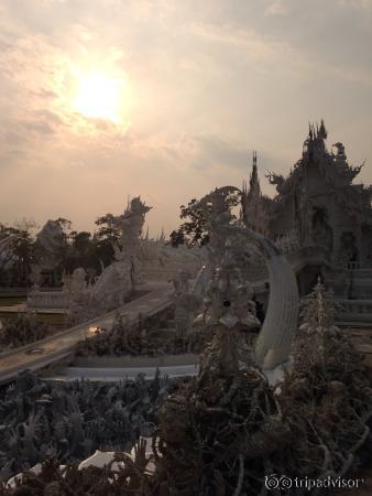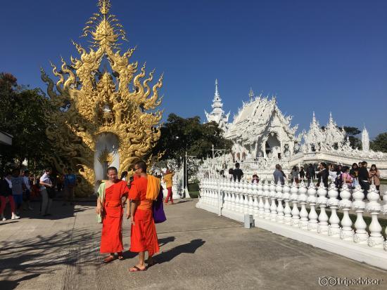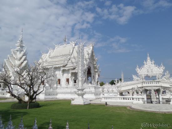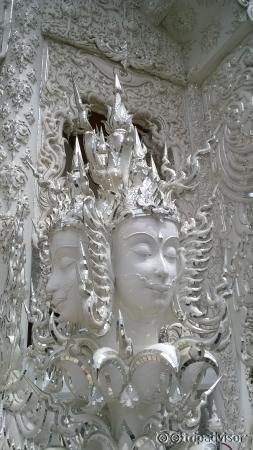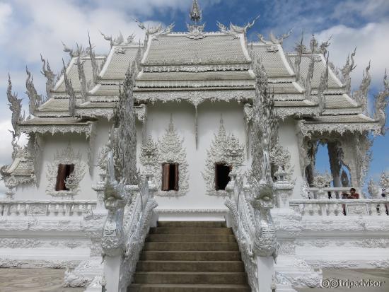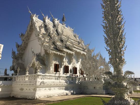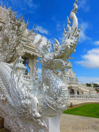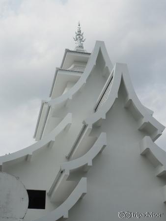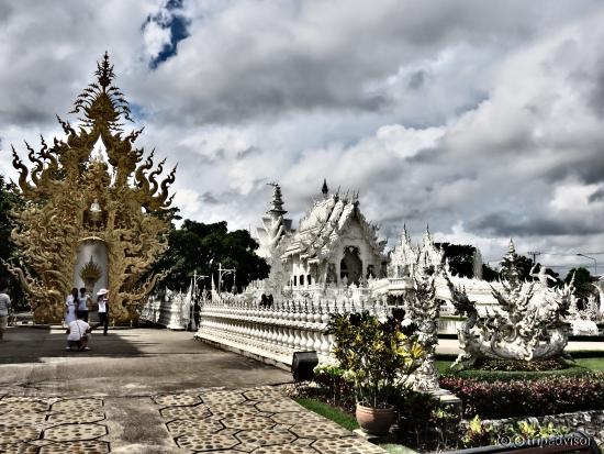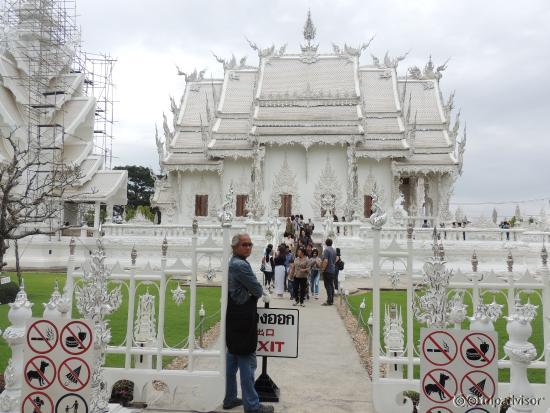 2015.1 初めてチェンマイから3時間かけチェンライのワット・ロン・クンに行きました。数年前の地震で塔の先端が曲がっていましたが、綺麗な白亜の寺院でした。