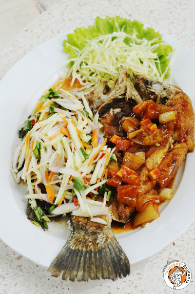 ส่วนอาหารก็ไม่ผิดหวัง แนะนำเมนู "ริมชลสองใจ" ที่ใช้ปลากะพงตัวใหญ่ผ่ากลางทอดในน้ำมันร้อนๆ จนเหลืองกรอบทั้งตัว แล้วราดด้วยน้ำยำ 2 ชนิด ข้างหนึ่งราดซอสเปรี้ยวหวาน อีกข้างราดน้ำยำมะม่วง อร่อยสุดคุ้มเหมือนได้ 2 เมนูในจานเดียว