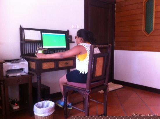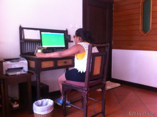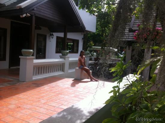 Outdoor entry to rooms with teak chairs, drying racks, and, in the evening lovely incense pots.