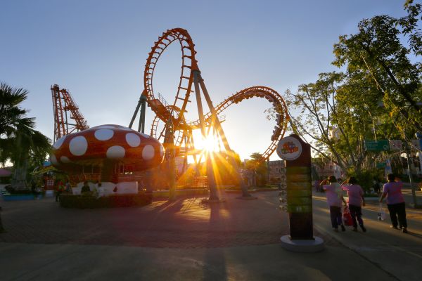 แดดร่มลมตกก็ได้เวลาออกจากสวนน้ำไปปลุกพลัง(ความแก่)ในตัว คราวนี้เราเลือกที่จะเดินกลับจากสวนน้ำเพื่อจะได้สำรวจเครื่องเล่นต่างๆของสวนสยาม สังเกตุได้ว่า ตอนเย็นคนเยอะกว่ากลางวัน ส่วนใหญ่จะเป็นวัยรุ่น อาจจะเป็นเพราะว่า กลางวันอากาศร้อนและเด็กๆปิดเทอม กางแผนที่แล้วก็ชี้ที่แรกที่จะไปคือ Vortex ซุปเปอร์เกลียวเหาะมหาสนุก ตัวนี้คนรอเล่นเยอะมากๆ ซึ่งเราก็ไม่พลาดที่จะลองสักหน่อย ส่วนตัวให้ 5 ดาวเลยกับเครื่องเล่นตัวนี้ เพราะสนุกและตื่นเต้นมาก เป็นรถไฟแบบให้เราห้อยขาให้ความรู้สึกตื่นเต้นมากๆมีจังหวะหนึ่งที่ขาเราเกือบจะแตะถึงพื้น และพีคสุดตรงที่ตีลังกาแบบเป็นเกลียว นี่แค่ด่านแรกนะเนี่ย ใจคอเริ่มไม่ค่อยดีแล้ว