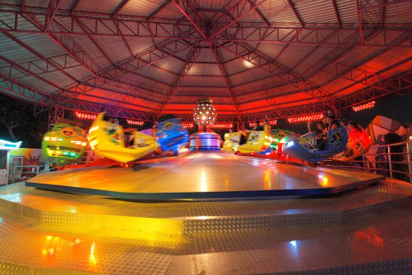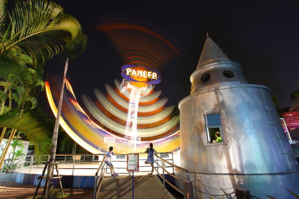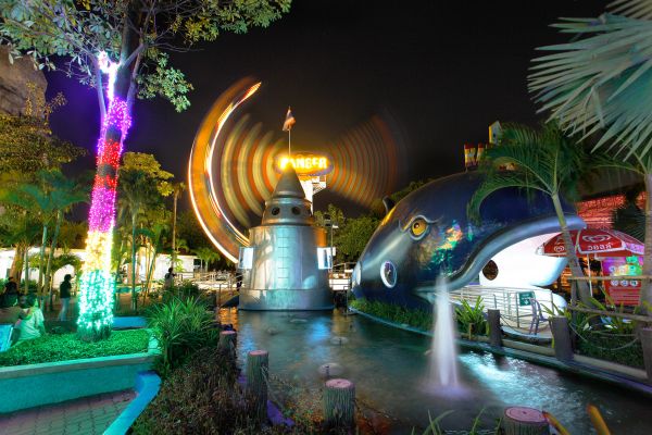 กำลังเพลินกับเครื่องเล่นอยู่แหงนหน้ามองท้องฟ้าดูนาฬิกาก็ปาเข้าไป 1 ทุ่ม!! โอ้ขุ่นพระนี้เป็นครั้งแรกที่ได้มาเที่ยวสวนสนุกในยามค่ำคืน ให้ความรู้สึกตื่นเต้นกระสับกระส่ายไปอีกแบบระหว่างตื่นเต้นกับบรรยากาศสวนสนุกตอนกลางคืนก็ต้องสะดุดตากับเครื่องเล่นหน้าตามุ้งมิ้ง มีปลาวาฬอยู่ตรงทางเข้า ไฟกระพริบๆเหมือนเรียกร้องให้เราเข้าไปลองตัวนี้โหดระดับ 10 เลย! เพราะมันจะพาเราหมุนท้าแรงโน้มถ่วงโลกแบบ 360 องศา!! ใช่แล้วฟังไม่ผิด หมุนเป็นวงกลมเลยทีเดียว มีจังหวะช้าๆหน่วงๆและก็มาค่อยๆเร็วแต่ไม่มาก คิดดูจะเสียวขนาดไหน