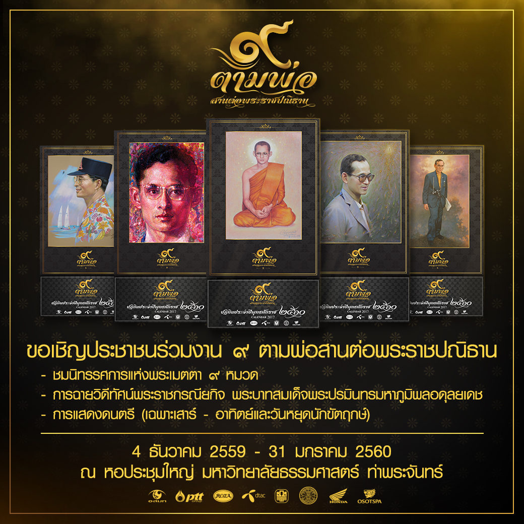ทั้งนี้ ขอเชิญประชาชนร่วมชมนิทรรศการและร่วมแสดงความจงรักภักดี ในงาน “๙ ตามพ่อสานต่อพระราชปณิธาน” ได้ในระหว่างวันที่ 5 ธันวาคม 2559 – 31 มกราคม 2560 ณ หอประชุมใหญ่มหาวิทยาลัยธรรมศาสตร์ ท่าพระจันทร์