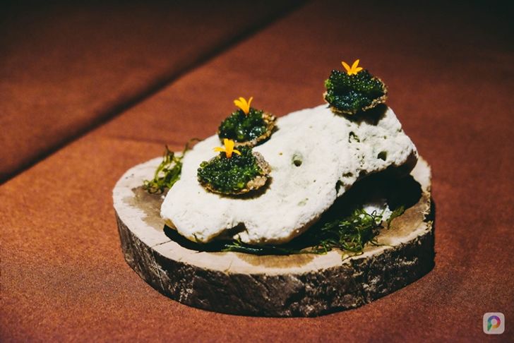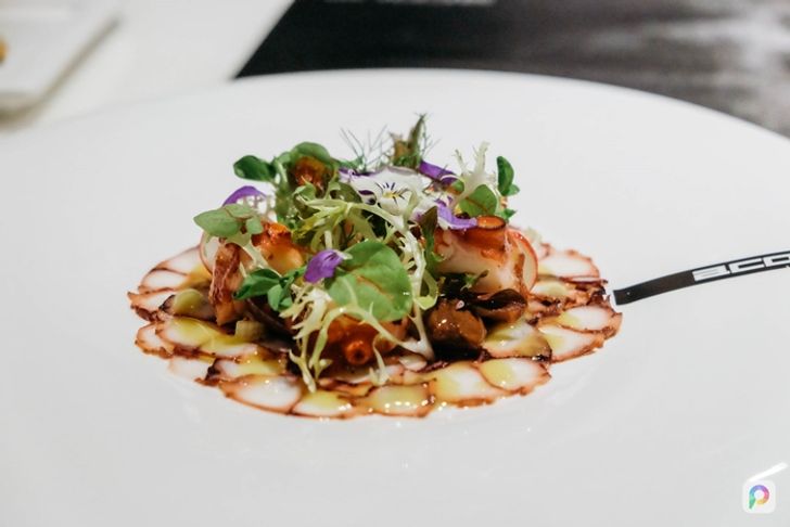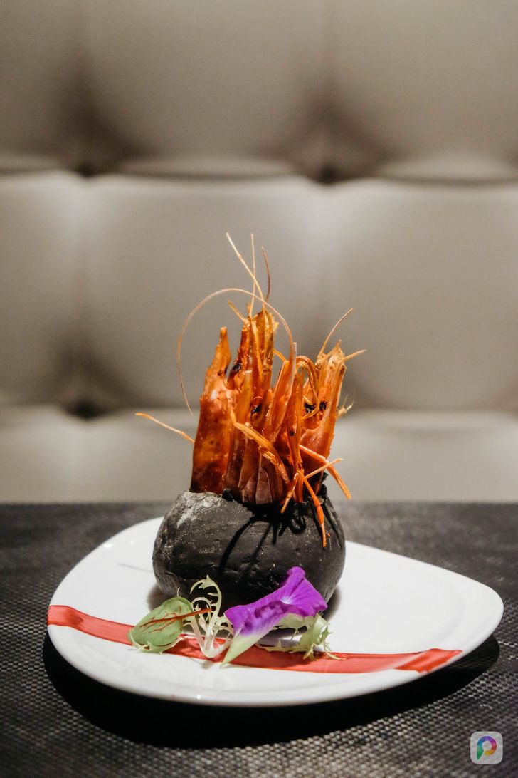 เราได้ลอง ไข่ลวกเสิร์ฟบนฟองดูว์ชีสพาร์เมซาน ทรัฟเฟิลดำ เเละพาวเดอร์แพนเชตต้า (Pancetta Powder) ที่บาลานซ์ความเค็มและความนุ่มนวลของไข่ได้อย่างดี ต่อด้วยกุ้งซิซิเลียนดิบรสหวาน