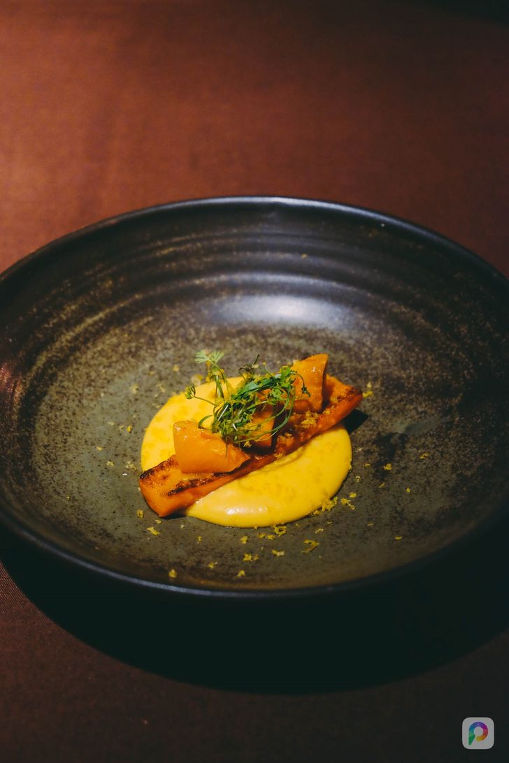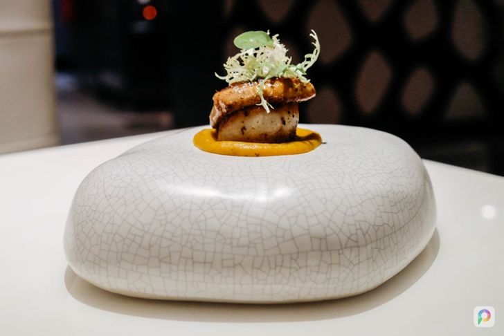 จานที่เราอยากบอกต่อว่าห้ามพลาดเป็นตับเป็ดและหอยเชลล์ตัวใหญ่เนื้อหวาน นำไปนาบกระทะจนได้ความกรอบนิดๆ ด้านนอก เสิร์ฟคู่กันมาบนซอสจากฟักทองและเห็ดทรัฟเฟิล เข้ากันได้อย่างสมบูรณ์แบบ