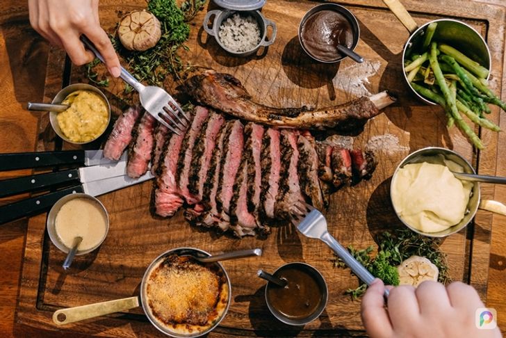 ส่วนจานใหญ่อิ่มแน่นอน มีสเต็ก Tomahawk (เริ่มต้นที่ 3,120 บาท/1.2 กิโลกรัม) ที่ใช้เนื้อวัวแบล็ค แองกัสจากออสเตรเลียมาย่างตามระดับความสุกที่ชอบ เสิร์ฟคู่กับเครื่องเคียงอย่างกระเทียมย่าง ซอสบาร์บีคิว ซอสบลูชีส มันบด กราแต็งมันฝรั่งและผักย่าง