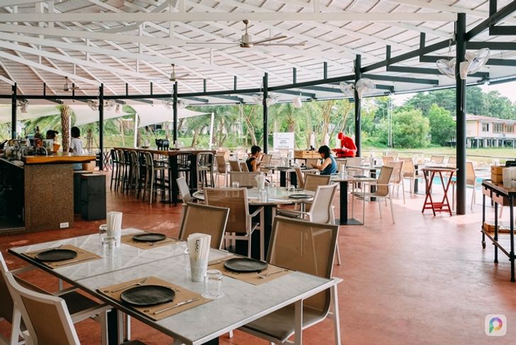 ที่นี่ตั้งอยู่ติดกับบ่อน้ำขนาดใหญ่ที่มีฉากหลังเป็นต้นไม้ร่มรื่น ได้บรรยากาศโปร่งสบาย ไม่อึดอัด แถมยังมีบาร์ค็อกเทลขนาดใหญ่ด้านหน้า เหมาะทั้งพาครอบครัวมาทานมื้อกลางวันและแฮงก์เอาท์กับเพื่อนในค่ำ