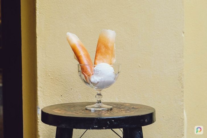 อีกจานที่เราชอบมาก เป็นบีโกหมอย (85 บาท) หรือไอศกรีมกะทิอัญชัญกับข้าวเหนียวดำน้ำกะทิรสเค็มๆ มันๆ ตัดรสชาติแบบลงตัว หรือลอง อาโป๊ง (75 บาท) ที่นำขนมทานเล่นของภูเก็ตซึ่งคล้ายแป้งเครปกรอบๆ มาทำเป็นไอศกรีมที่มีสัมผัสกรุบๆ ก็ดับร้อนได้ดีไม่น้อย