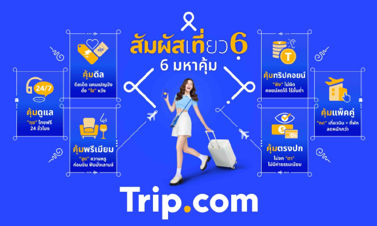 Trip.com ผู้ให้บริการด้านการท่องเที่ยวครบวงจร เปิดตัวแคมเปญใหม่ “สัมผัสเที่ยว 6 มหาคุ้ม - Travel 6th Sense” เพื่อเน้นย้ำการให้บริการแอปท่องเที่ยวที่ ครบ จบ ในทีเดียว ตอบโจทย์ทุกความคุ้มให้นักเดินทาง ด้วยความคุ้มทั้ง 6 ประสบการณ์ที่นักเดินทางจะได้รับเมื่อทำการจองผ่าน Trip.com