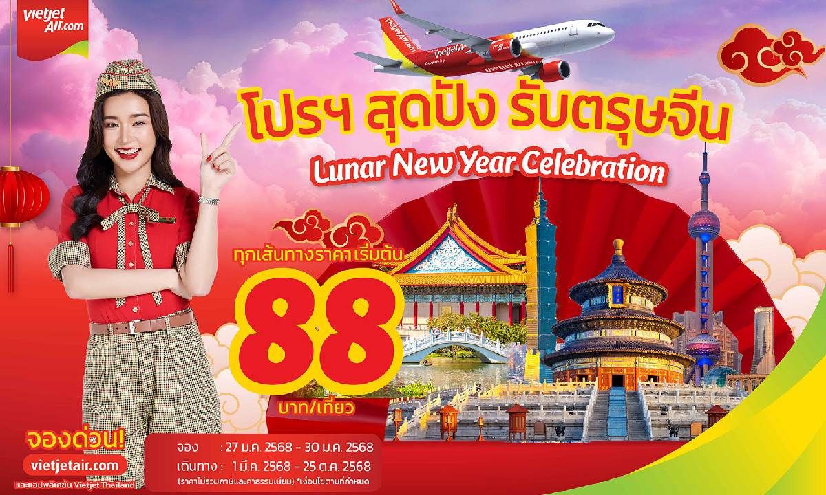 เวียตเจ็ทไทยแลนด์จัดโปรฯ สุดปัง รับตรุษจีน ตั๋วเริ่มต้นเพียง 88 บาท