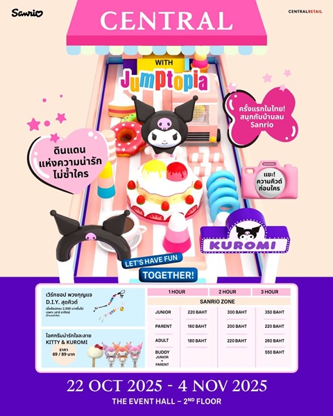 สำหรับแฟน ๆ ‘MY MELODY’ และ ‘KUROMI’ ที่ยังฟินไม่พอ! ห้างเซ็นทรัลขอชวนมาสานต่อความน่ารักแบบจัดเต็มที่งาน “CENTRAL SANRIO CHARACTERS FAIR 2025” ระหว่างวันที่ 17 ต.ค. 68 – 4 พ.ย. 68 ณ The Event Hall ชั้น 2 ห้างเซ็นทรัลชิดลม พบกับ 3 ไฮไลต์สุดคิวต์ที่บอกเลยว่า “ปังไม่แพ้ที่แรก” แน่นอน!
