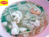 นำมาลวก ก่อนเสริฟโรยหน้าด้วยกระเทียมและคึ่นฉ่ายหั่น
