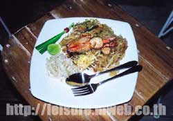 วิธีทำ นำเส้นก๋วยเตี๋ยวใส่ลงในกระทะแล้วใส่น้ำลงไปเล็กน้อย ผัดจนเส้นนิ่มแล้วกับเส้นไว้ที่ริมกระทะ หลังจากนั้นใส่น้ำมันเล็กน้อยแล้วนำกระเทียมลงเจียวพอหอม ใส่เต้าหู้ หัวไชโป๊สับ ผัดให้เข้ากันแล้วเขี่ยเส้นลงผัดใส่น้ำตาลทราย น้ำะขามเปียก น้ำปลา กุ้งสด ผัดให้เข้ากันอีกครั้ง แล้วกันเส้นไว้ที่ริมกระทะ ใส่น้ำมันลงไปอีกเล็กน้อยแล้วต่อยไข่ไก่ลงไป 1 ฟองตีให้แตกแล้วขยี้ให้กระทะเขี่ยเส้นลงผัด ใส่ถั่วงอก ใบกุยช่าย ถั่วลิสงป่น แล้วผัดให้เข้ากันอีกครั้ง เสิร์ฟพร้อมถั่วงอกดิบ ต้นกุยช่าย มะนาว หัวปลี และเครื่องปรุงรส น้ำปลา น้ำตาล พริกป่น ข้าวผัดอเมริกัน ส่วนประกอบ ข้าวสวย ไส้กรอก น่องไก่เล็ก หมูแฮม ไข่ไก่ เม็ดลูกเกด ซอสมะเขือเทศ ซอสปรุงรส น้ำมันพืช มะเขือเทศ แตงกวา วิธีทำ นำน้ำมันใส่ลงในกระทะพอร้อนจึงใส่ข้าวสวยลงไปผัด เสร็จแล้วจึงใส่เม็ดลูกเกด ซอสมะเขือเทศ และซอสปรุงรสลงไปผัดให้เข้ากันอีกครั้ง ตักใส่ภาชนะที่เป็นถ้วนแล้วนำไปคว่ำในจานที่เตรียมเสิร์ฟ หลังจากนั้นนำไส้กรอก น่องไก่เล็ก หมูแฮม ที่ทอดเสร็จแล้วมาเรียงใส่จาน โป๊ะหน้าข้าวด้วยไข่ดาว เสิร์ฟพร้อมมะเขือเทศหั่น แตงกวา ซอสมะเขือเทศและซอสปรุงรส |